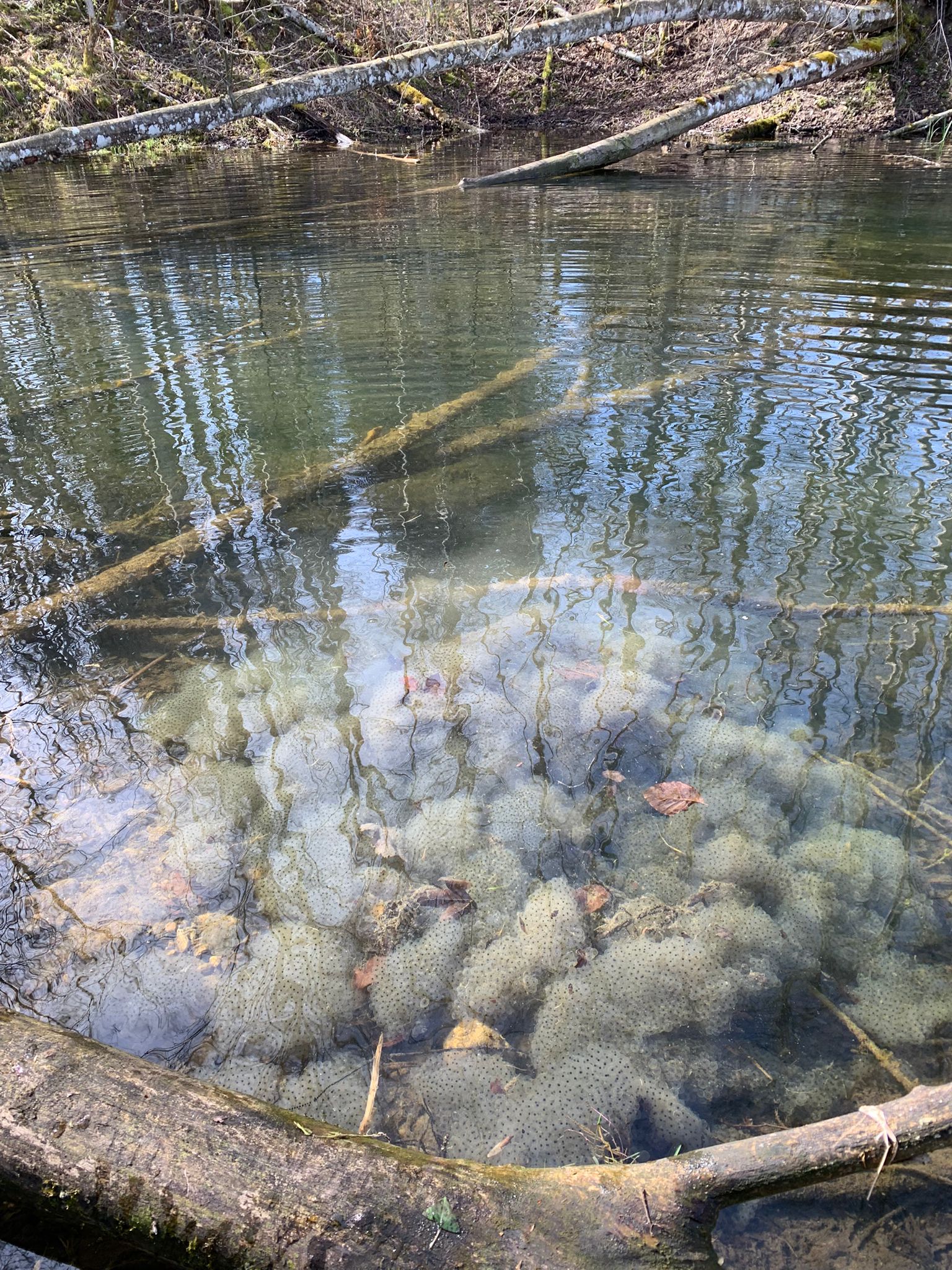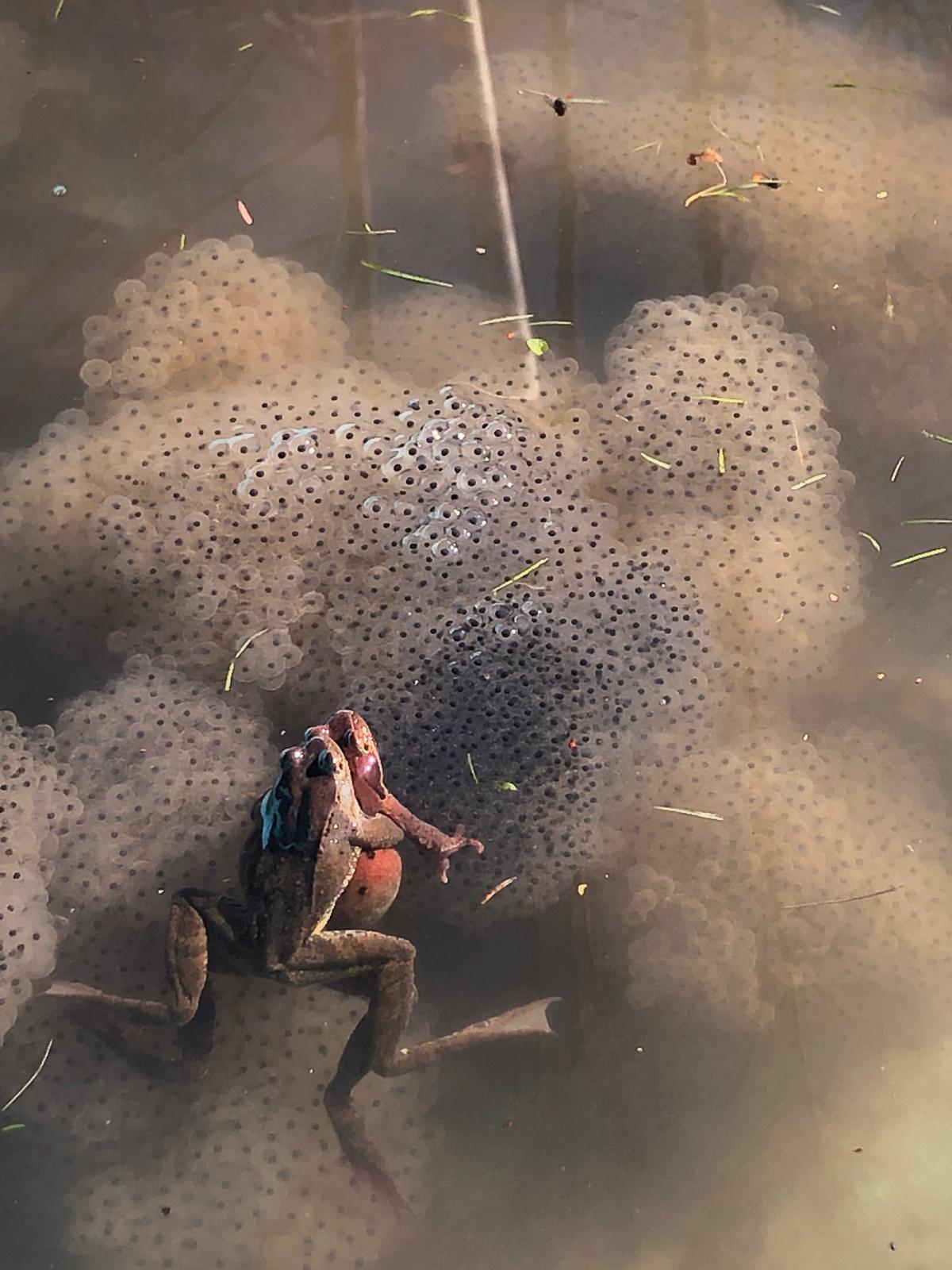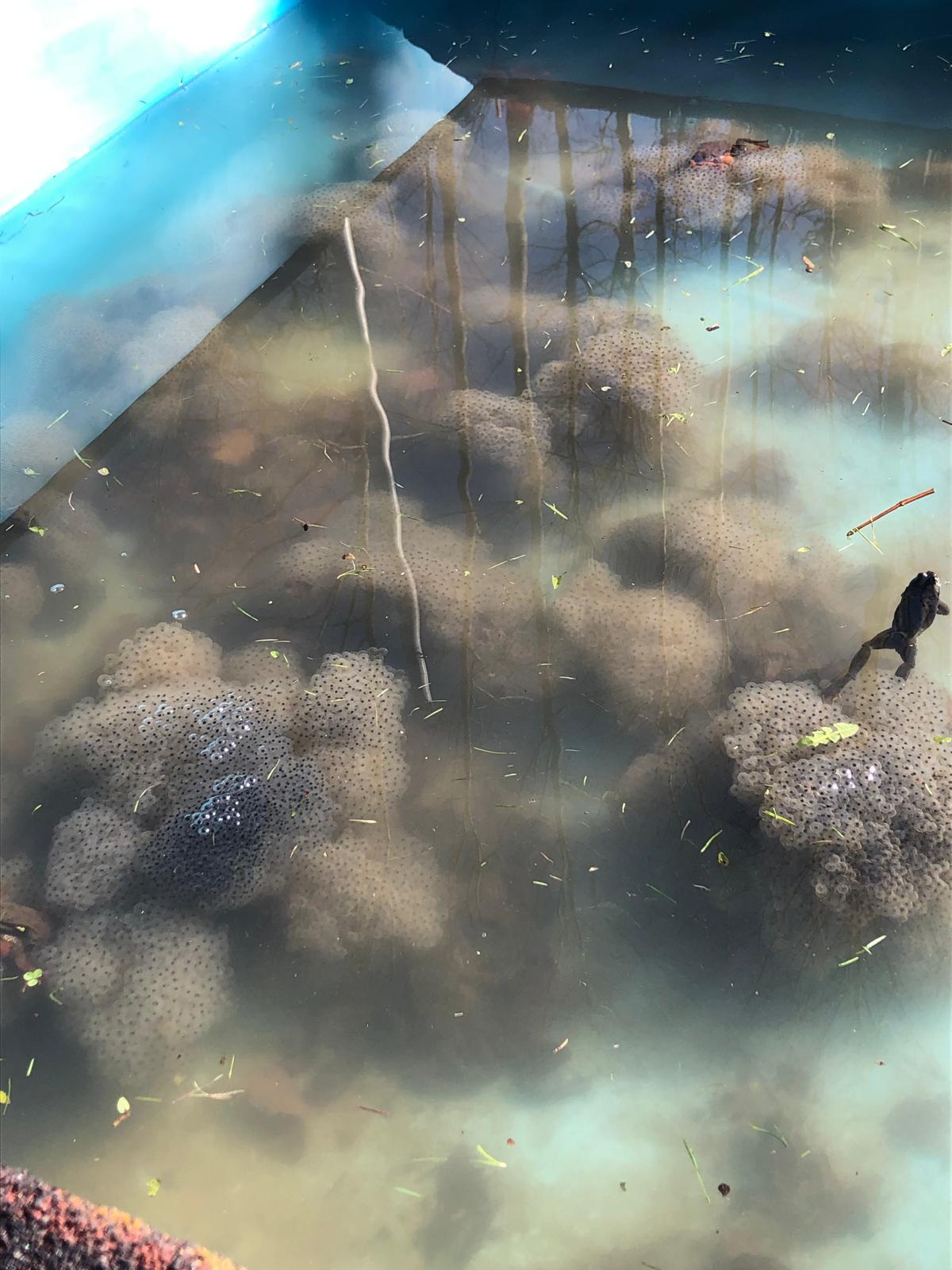 In einer weiteren Aktion wurde der Frosch- und Krötenlaich in Absprache mit der unteren Naturschutzbehörde in einen nahegelegenen Auenwald mit mehreren stillen Gewässern gebracht. Die Gewässer liegen nahe der Ortschaft Schmidsfelden und es wurden mindestens 200 Laichballen umgesetzt. Wir hoffen, dass sich dadurch eine neue Amphibienpopulation entwickeln kann. Die Gewässer sind von einem Waldgebiet umgeben und es besteht dadurch keine Gefahr durch den Straßenverkehr. Des Weiteren besteht hier kein Nutzungskonflikt mit dem Freibadbetrieb. Nichtsdestotrotz gibt es weiterhin ein sicheres Vorkommen von Amphibien am Freibad im Kreuzthal. Adulte Tiere kann man nicht versetzen, da sie an Ihr Geburtsgewässer gebunden sind.