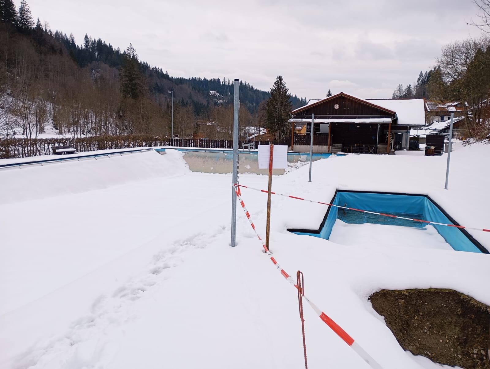 Nun gab es dringenden Handlungsbedarf, da die Wanderungen der Amphibien bald losgehen würde und kein Gewässer zur Verfügung stand. Nach Absprache mit dem Bauhof der Gemeinde Buchenberg, war es möglich das kleine Kinderbecken wieder zu befüllen, damit die Amphibien dies als alternativen Laichplatz nutzen können. Zusätzlich wurde in einer gemeinsamen Aktion vom BUND Naturschutz und den ehrenamtlichen Helferinnen vor Ort ein Zaun an der Straße aufgebaut, damit die Amphibien nicht in das leere Schwimmbecken fallen, sondern von den Helferinnen abgesammelt und dann sicher ins Kinderbecken gebracht werden konnten.