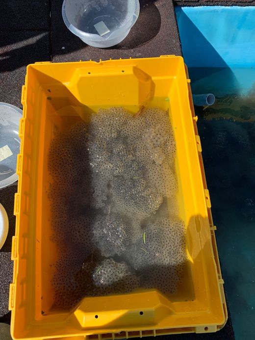 Wir mussten spontan - natürlich mit Erlaubnis der Unteren Naturschutzbehörde - viel Laich umsiedeln. So darf der künftige Frosch-Nachwuchs aus dem Bad im Kreuzthal nun in Schmidsfelden planschen. Über 200 Laichballen konnten wir hier an Ostern retten und evakuieren. Ein richtiger Kraftakt im wahrsten Sinne des Wortes!